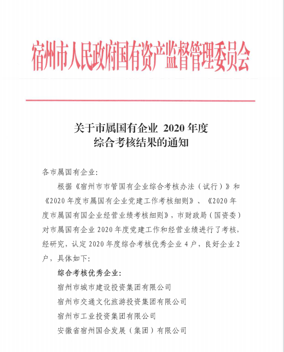 宿州交通文化旅游投資集團(tuán)有限公司2020年度考核結(jié)果